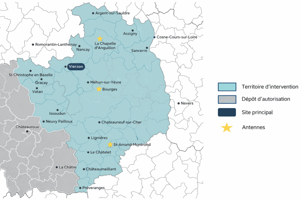 L’HAD Santé Service du Berry intervient sur l’ensemble du département du Cher (18) et sur les secteurs d’Issoudun, Vatan et alentours pour le département de l’Indre (36).