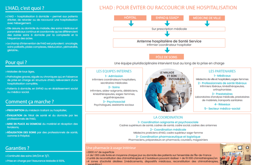 L’hospitalisation à domicile est, le plus souvent, prescrite par le médecin traitant qui continue d’assurer le suivi médical pendant l’hospitalisation, en lien avec les médecins praticiens d’HAD et de l’EHPAD/ESMS. Sans se substituer aux prestations sanitaires et médico-sociales dispensées dans ces établissements, Santé Service apporte un savoir-faire hospitalier et logistique qui assure une prise en charge complète et sécurisée des patients nécessitant des soins très techniques.
