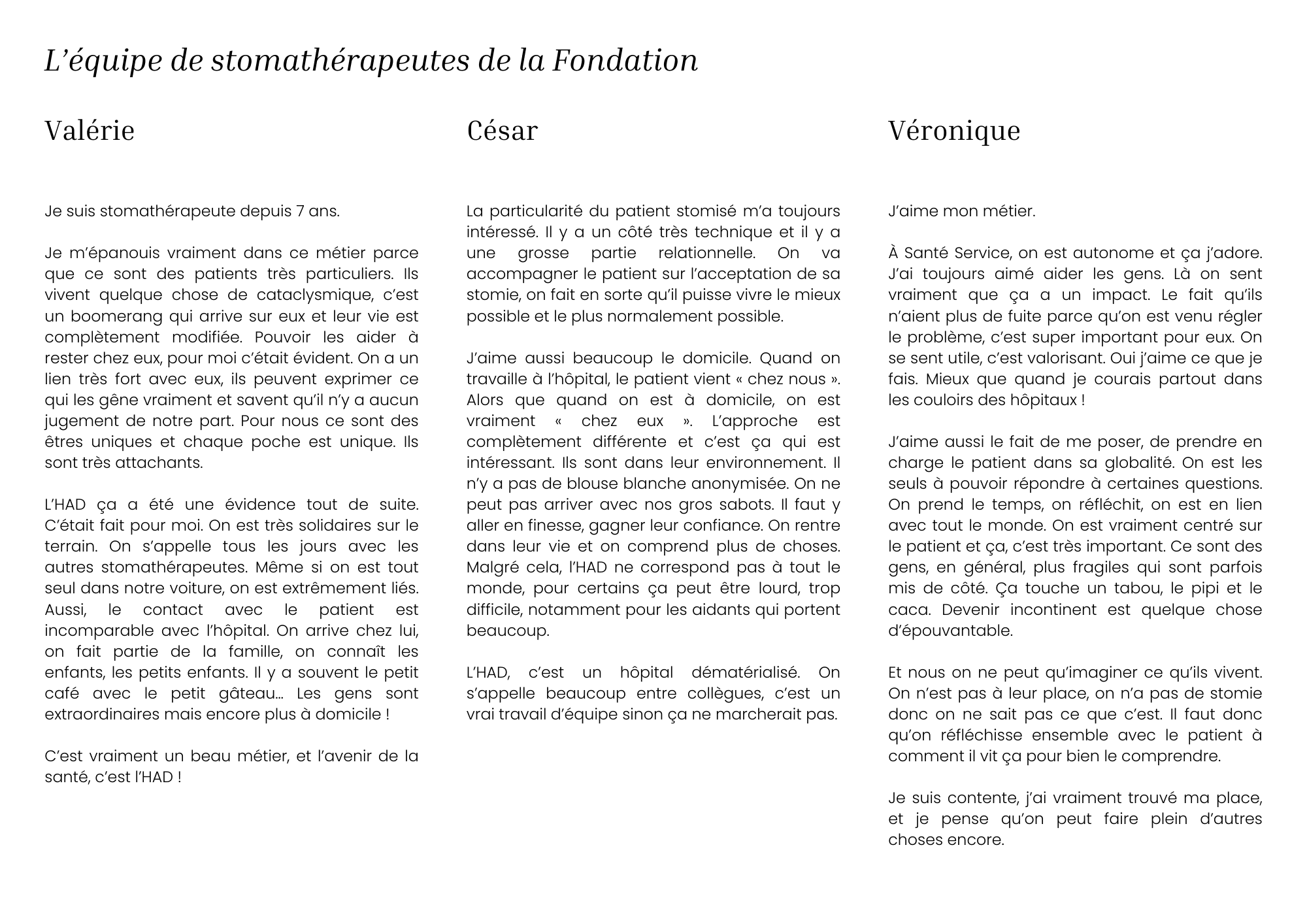 La direction des soins et l’équipe de stomathérapeutes – Véronique, César, et Valérie -, pour leur enthousiasme et leur grande implication dans la mise en œuvre de ce projet.